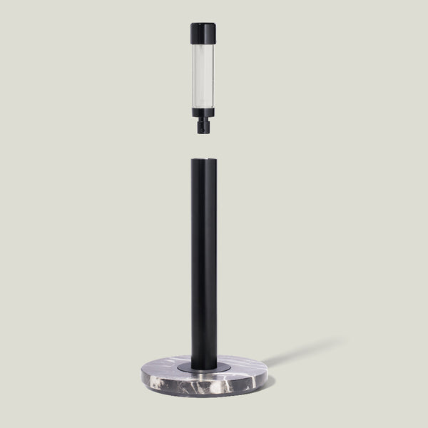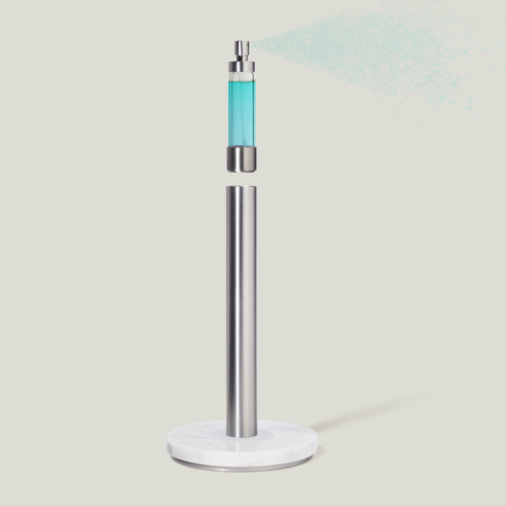 More than meets the eye, the polished stainless-steel post hides a refillable ready-to-use spray bottle for everything you need to keep your surface areas clean. Its heavy foundation is an anchor to tear off paper towels easily while a silicone ring at the base of its post keeps towels from unruly unraveling.